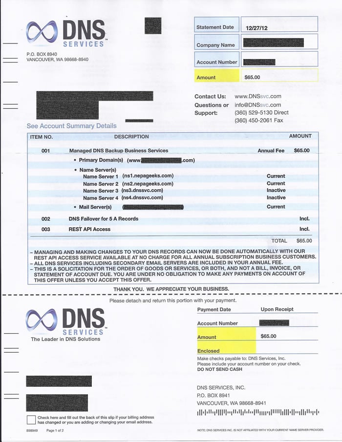 In other words, it’s not a bill; you owe nothing. DNS Services simply wants to charge you so they can provide a service that you are not yet receiving. Think of this more like an advertisement — albeit, one so cleverly disguised to look like a bill that unsuspected customers might feel compelled to pay it, and that’s the problem. Unsuspecting customers have been sending DNS Services money for a service they didn’t want or need. What’s worse, we’ve read first-hand reports from other sites warning about DNS Services that a lot of these folks are having trouble getting their money back.